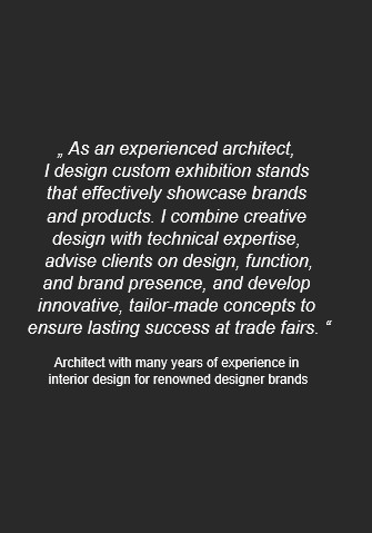 Our team combines expertise in design, architecture, event management, and structural design – creating appearances that inspire and leave a lasting impression. We unite a trained eye for detail with a clear sense of the bigger picture. Every concept reflects our belief that function and aesthetics are inseparable. We place great importance on personal consultation and genuine, collaborative partnerships. Our strength lies in the architectural and structural realization of your vision – precise, individual, and driven by passion