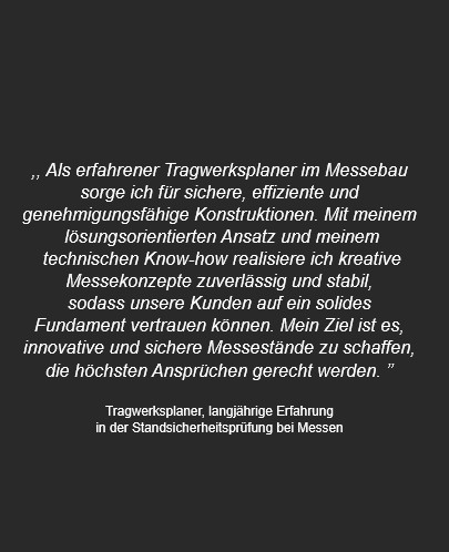 Unser Team vereint Expertise aus Design, Architektur, Eventmanagement und Tragwerksplanung – für Auftritte, die begeistern und Wirkung hinterlassen. Wir kombinieren ein geschultes Auge fürs Detail mit dem Blick für das große Ganze. Jeder Entwurf verkörpert unsere Überzeugung: Funktion und Ästhetik sind untrennbar verbunden. Dabei legen wir größten Wert auf persönliche Beratung und eine partnerschaftliche Zusammenarbeit auf Augenhöhe. Unsere Stärke liegt in der architektonischen und statischen Umsetzung Ihrer Vision – präzise, individuell und mit Leidenschaft.